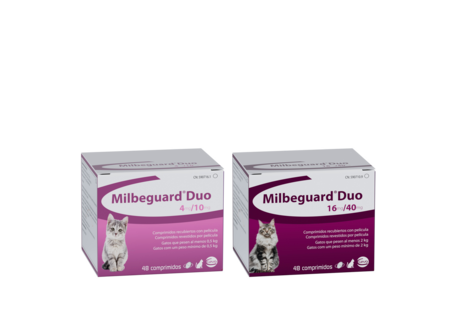 - Milbeguard® Duo para gatos contiene Milbemicina oxima y Prazicuantel
